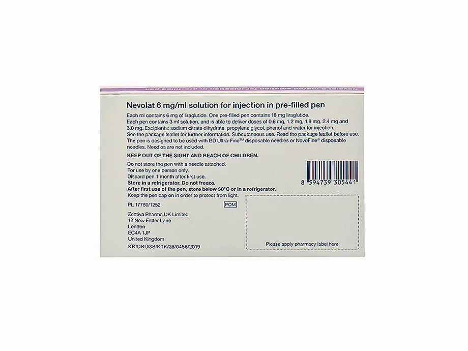 Nevolat is a type of weight loss medication known as a glucagon-like peptide-1 (GLP-1) receptor agonist. It is injected subcutaneously (under the skin) once daily and contains the active ingredient liraglutide, which is also found in the now-discontinued brand Saxenda. The treatment is manufactured by Zentiva and should be taken as part of an active lifestyle.